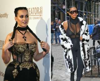 Эффектный прозрачный корсет, обтягивающие легинсы вместо брюк, остроносые туфли на шпильках — никого не напоминает? На наш взгляд, Кэти Перри здесь очень похожа на Ким Кардашьян. Сходства добавляют и две длинные косички: с такими же звезда реалити была замечена накануне показа Канье Уэста в Нью-Йорке.