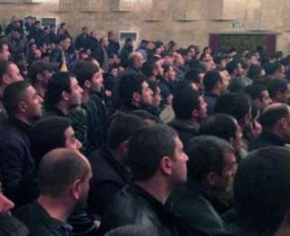 Мужчины призывного возраста собрались у сборного пункта в Степанакерте.