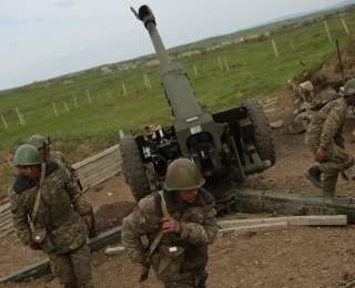 Мы сворачиваем к большому ангару и нескольким полуразрушенным зданиям. Это оказывается артиллерийская батарея армии обороны НКР, здесь стоит несколько гаубиц — на холмах за ними видны воронки от попаданий азербайджанских снарядов.