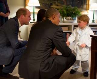 Президент США Барак Обама и первая леди Мишель Обама (на заднем плане) встречаются с принцем Джорджем в Кенсингтонском дворце в Лондоне.