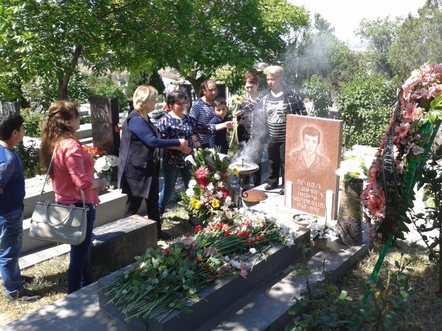 Майор Аркадий Багдасарян только спустился с боевых постов и через несколько дней вновь присоединится к друзьям. Сегодня он также находится в «Ераблур», пришел посетить могилы своих погибших друзей.