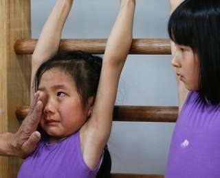 Тренер вытирает девочке слезы на уроке гимнастики. Китайские спортивные школы известны тем, что заставляют детей работать на пределе физических возможностей, чтобы делать из них олимпийских чемпионов.