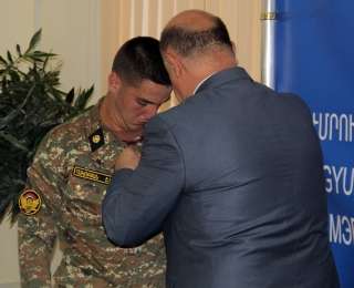 Чтобы увидеть героя, работники мэрии под аплодисменты поприветствовали вернувшегося после службы в родной город старшего сержанта Шули Акопяна. Однако сюрпризы родного города на этом не закончились. За беспрецедентную отвагу и храбрость, за проявления патриотического духа во время боевых действий, Шули Акопян, сбивший три танка противника, был награжден "Золотой медалью". Награду ему вручил мэр города. Но при этом солдат скромничает: мол, что тут такого, просто выполнял свой долг.