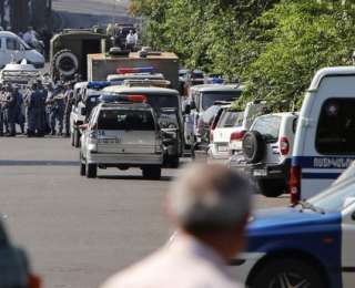 По последним данным, во время нападения на полицейский полк в Ереване были взяты восемь заложников. Один страж порядка погиб, двое были ранены. Сейчас район ЧП оцеплен, к месту стянуты спецподразделения и бронетехника.