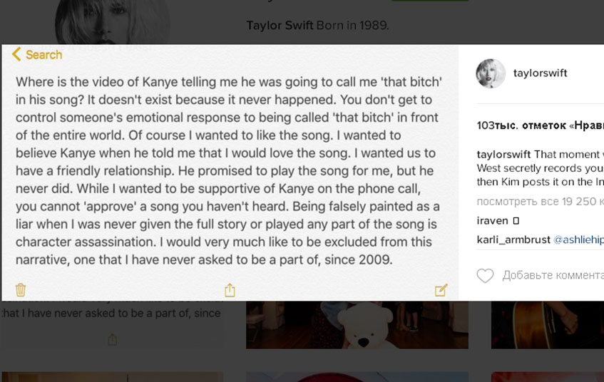 Когда запись телефонного разговора стараниями Ким попала в сеть, Тейлор заявила, что она недовольна таким положением дел. «Тот момент, когда Канье тайно записывает разговор с тобой, а Ким выкладывает его в сеть», - написала она в Instagram и подробно объяснила ситуацию.