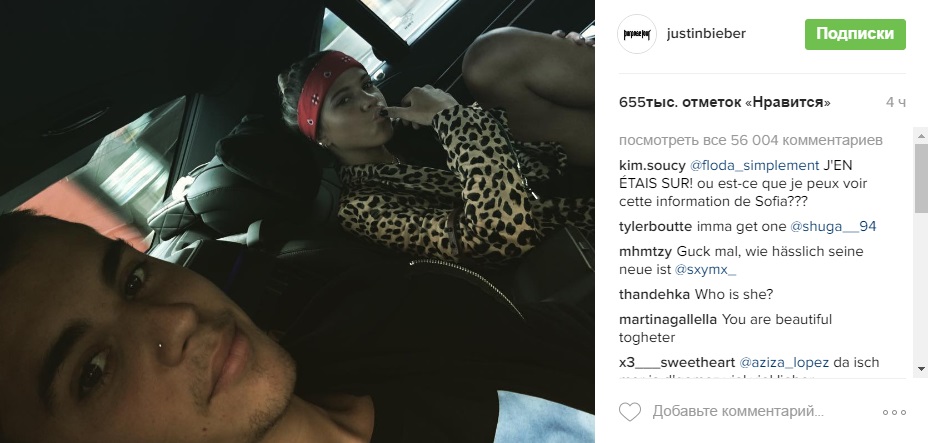 За прошедший вечер он выложил три совместные фотографии в свой Instagram: первое селфи сделала сама София с полуголым Джастином за спиной, потом певец сфотографировал возлюбленную в машине. Посмотрим, может роман продлится больше недели?