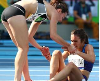 Во время вчерашнего полуфинального забега на 5000 метров столкнулись бегуньи Никки Хэмблин из Новой Зеландии и Эбби ДАгостино из США. ДАгостино сильно ушиблась и не смогла сразу встать, но Хэмблин прервала свой забег и пришла ей на помощь.