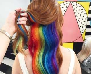 Чтобы создать такой эффект, твой мастер должен разделить волосы сначала горизонтально на две части. Красить нужно будет именно нижнюю. Далее необходимо выделить семь прядок и покрыть их красителями в соответствии с радужной расцветкой: красным, оранжевым, желтым, зеленым, голубым, синим и фиолетовым.