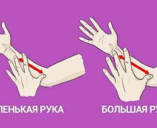 Тебе нужно всего лишь измерить ладонью одной руки расстояние от локтя до запястья другой, так, как нарисовано на картинке. Если ты смог дотянуться до запястья, поздравляем, значит у тебя большая рука. Если не смог — тоже поздравляем, рука у тебя маленькая.