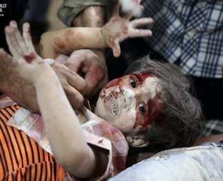 Пострадавший в результате авиаудара ребёнок находится в полевом госпитале в районе Дума в Дамаске, Сирия.