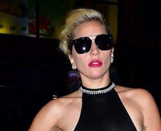 30-летняя американская певица и актриса Леди Гага (Lady Gaga) в черном просвечивающемся платье без бюстгальтера ночью в Нью-Йорке.