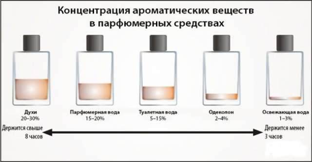Одеколон - чаще всего мужские ароматы, в которых содержится 2–4% парфюмерно масла, разбавленного в спирте, а все остальное — вода. Аромат продержится 2 часа.