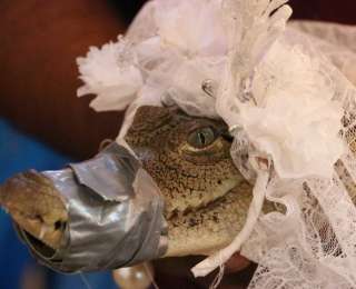 Жениться по любви не могут не только короли, но иногда и мэры. К примеру, глава мексиканского города Сан-Педро-Уамелуа с не менее сложным именем Хэль Васкес Рохас. Этим летом мэр женился на крокодиле. Речь не о страшненькой женщине, а о настоящей крокодилице, которую перед бракосочетанием нарекли романтичным именем Мария-Изабель. По крокодильим меркам она, вероятно, весьма красива, тем более что и одета была, как и положено невесте, в платье и фату. Впрочем, выходила замуж с перевязанной пастью. После торжественных гуляний и поцелуя жениха (в одеяние «новобрачной», а не в ее пасть), «невеста» была отпущена в местный пруд.
