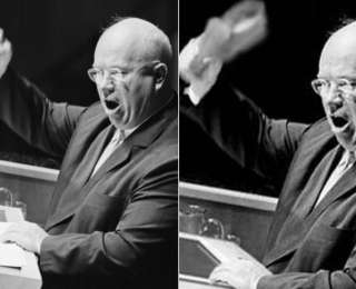Когда Хрущев поднялся на трибуну, никакого ботинка в руках у него уже не было. Он размахивал кулаком, но по трибуне ничем не стучал. Появившийся позже башмак у него в руке на фото в некоторых газетах – не более чем фотомонтаж. Есть только одна фотография, на которой генсек сидит на своем месте, а ботинок лежит перед ним на пюпитре. Филиппинцу Хрущев предложил «взять заступ и поглубже похоронить империализм», а в газетах потом написали: «Разъяренный Хрущев молотит ботинком по трибуне Генеральной Ассамблеи ООН и в исступлении кричит: «Мы вас похороним!»». Так и родился миф.