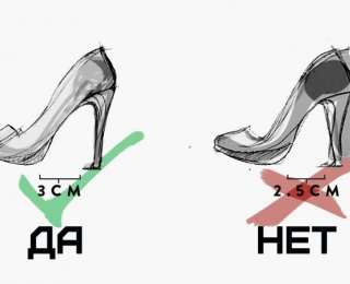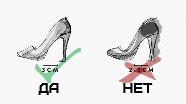 Ключевым фактором в ощущениях при носке туфель является расстояние между подошвой и каблуком. Чем оно больше, тем комфортнее носить обувь (минимум: 3 сантиметра). Если расстояние меньше этого значения, значит, подъем у туфель слишком крутой и вес будет переноситься в основном на пальцы.