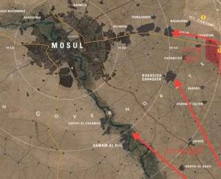 На карте показана оперативная обстановка по положению на 18 октября 2016 года, когда иракские силы, курдские пешмарга, ополченцы и части Ниневийской равнины продолжили развивать начатое на рассвете 17 октября наступление.