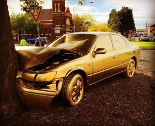 16 октября 2016 года в Мельбурне, Австралия, автомобиль Toyota Camry врезался в дерево. Водитель скрылся с места происшествия, оставив ключи в замке зажигания, что наталкивает на мысль об угоне машины. Тачку так никто и не убрал, и неделю спустя неизвестный уличный художник покрыл ее золотом, превратив в своеобразный памятник.