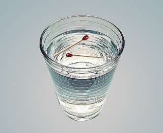 - Придерживая спичку за свободный от серы конец, расположи ее вертикально в 4–5 сантиметрах от поверхности воды прямо посередине стакана.