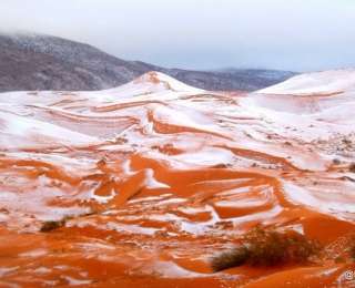 Алжирский город Айн-Сефра считается воротами в Сахару, поэтому он слабо ассоциируется с зимой. Поэтому представьте удивление фотографа Карима Бучетата, когда проснувшись с утра он увидел снег на песках пустыни. Подобное явление происходит крайне редко - около одного раза в десять лет.