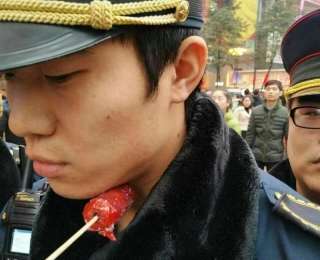 Танхулу - традиционная китайская сладость, представляющая собой засахаренные фрукты и ягоды на палочке. Торгуют ими на каждом углу, и в большинстве случаев нелегально. Патрульный полицейский подошел к одному из нелегальных киосков и попросил 45-летнюю женщину свернуть торговлю, за что получил леденец в горло.