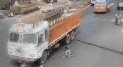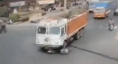 В Индии женщина чудесным образом не пострадала в столкновении скутера с грузовиком, хотя ее почти затянуло под колеса.