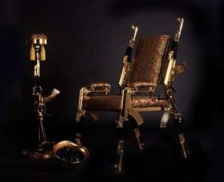 Художник Рейнир Вебер читал биографическую книгу о Михаиле Калашникове, когда к нему пришла муза. Он купил несколько АК-47 и собрал на их базе роскошный позолоченный стул из ткани из Лондона и Венеции. Теперь продает его за 127 000 долларов. В комплект также входит торшер и каска.