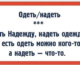 Ничто так не раздражает языковых пуристов, как путаница с глаголами «одеть» и «надеть». По ним, как и по роду кофе, многие определяют культурный уровень собеседника. Но только ли дело в «одеть» и «надеть»? Почему лишь эта парочка отдувается за остальных? Здесь собрано 10 пар слов, в которых чаще всего допускаются ошибки…
