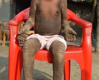 Тело 8-летнего Мехенди Хасана из Бангладеш покрыто толстым слоем чешуйчатой кожи, при прикосновении к которой мальчик испытывает сильную боль. Из-за редкого заболевания, превращающего Мехенди в камень, взрослые и дети избегают общения с ним.