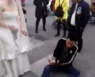 Недавно в Китае была замечена колоритная пара - невеста, тянущая за собой молодого человека на цепи. Согласно сообщениям в соцсетях, в торжественный день жених куда-то пропал, и его суженая отправилась на поиски. Судя по одежде парня, на свадьбу он явно не собирался.