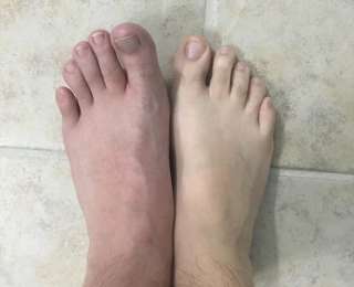 Далее лечение продолжили, но с гораздо более высокой концентрацией препарата. В результате, нога начала набухать и он даже не мог поставить ее на пол.