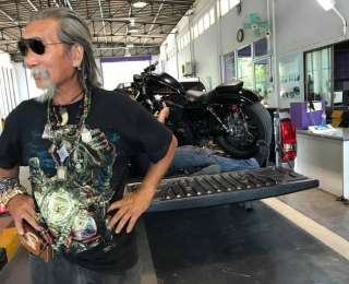 Мужчина в потрёпанной одежде засмотрелся на мотоцикл Harley-Davidson стоимостью около 600 тысяч батов (примерно 17 360 долларов).
