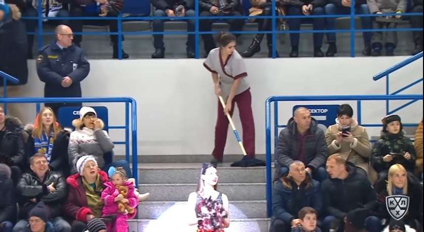 Радует, что наконец-то подобные шоу начали появляться и на наших просторах. Сегодня мы поделимся с тобой роликом, снятым на хоккейном матче в Хабаровске. Во время перерыва, когда на площадке должны были выступать красивые девочки, в одном из проходов появилась не менее симпатичная уборщица…