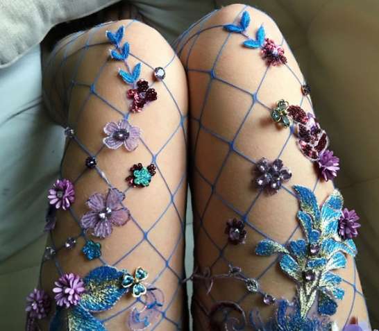 Создатель этих фэшн-шедевров – Лирика Матоши, дизайнер из Нью-Йорка, США. Основой для творчества служат колготки в крупную и мелкую сетку, которые креативно оформляются стеклянными камнями, бисером, искусственными цветами.