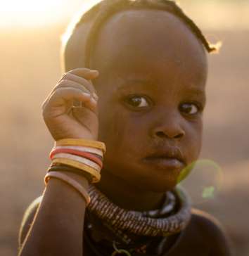 Малышка химба играет с одной из своих косичек. По традиции она будет укладывать волосы в две косы так, чтобы те росли на лицо. Когда девочка достигнет половой зрелости, она отбросит свои волосы назад, заплетет их в несколько жгутов и украсит смесью молочного жира и охры
