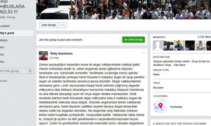 В азербайджанском сегменте социальной сети Facebook интернет-пользователь Тофик Ибрагимов, публикующий время от времени сведения об истинном положения дел в азербайджанской армии, в группе “Свободу политзаключенным” сделал новую публикацию, в которой он подробнее рассказывает о недавно случившемся инциденте.