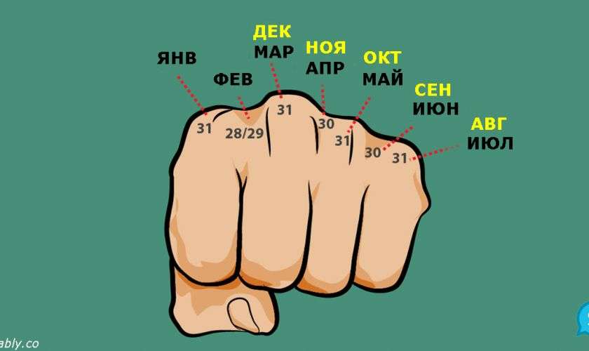 Сожмите кулаки обеих рук, и начните считать месяцы по суставам и промежуткам между ними. Если месяц приходится на сустав, в нем 31 день. Если он попадает в пространство между ними, в нем 30 дней (или, в случае февраля, даже меньше).