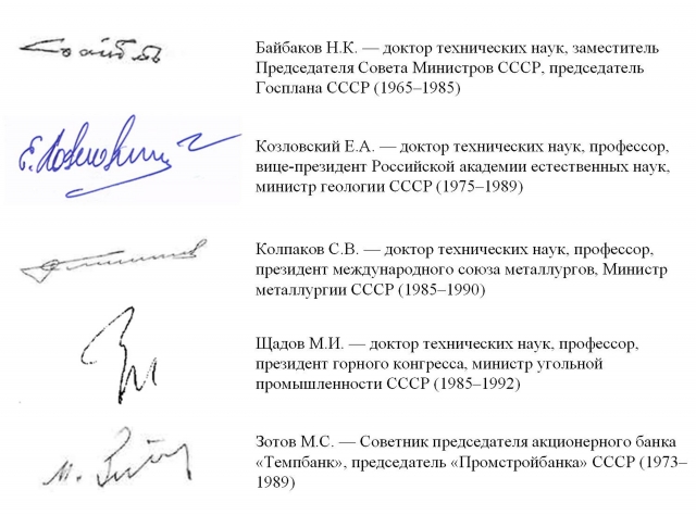 Щадов М. И. — доктор технических наук, профессор, президент горного конгресса, министр угольной промышленности СССР (1985−1992)