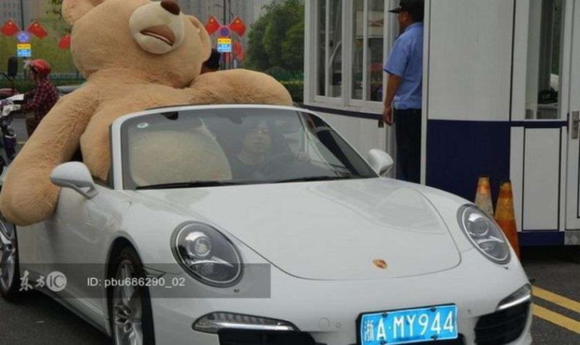 Сын богатого китайского бизнесмена из Ханчжоу потратил более 10 000 юаней ($1500) на покупку огромного 2,5-метрового медведя, чтобы удивить девушку и признаться ей в любви. Он усадил мишку в свой белый Porsche 911 Targa и подъехал к университету к окончанию занятий. Китаец встретил девушку с огромным мишкой, признался ей в любви, на что она ответила: "Мне медведь понравился, но ты не нравишься."