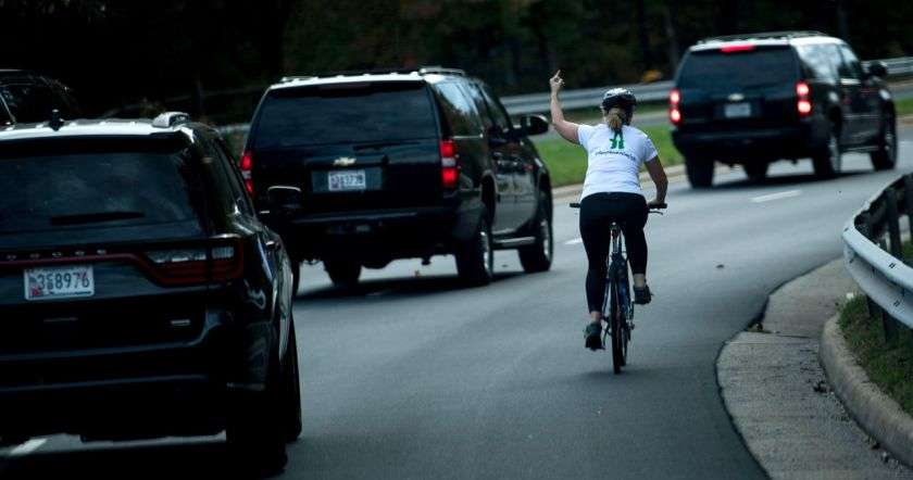 28 октября кортеж президента США Дональда Трампа выехал из гольф-клуба Trump National Golf Club в городе Стерлинг (Виргиния). Он проехал мимо двух пешеходов, один из которых показал опущенный вниз большой палец, а затем — мимо велосипедистки. Та несколько раз показала кортежу средний палец. Этот момент успел снять фотограф Брендан Смяловски.