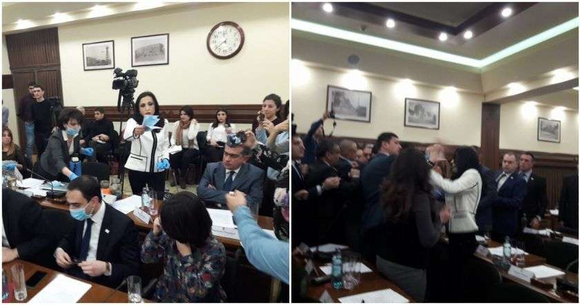 Члены «Еркир Цирани» надели маски и открыли стеклянные емкости, после чего в зале распространилось зловоние. Гор Варданян и несколько членов фракции РПА попытались остановить Мариам Хачатрян, которая с этими тарами направилась к мэру Еревана Тарону Маркаряну.