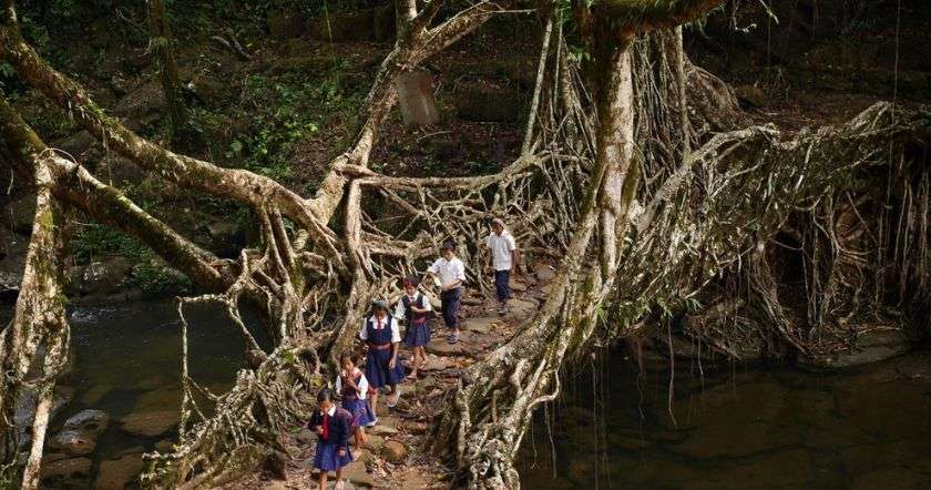 «Живые мосты» (так прозвали эти необычные сооружения) формируются местными жителями из корней деревьев. «Скелетом такого моста является бамбук, а корни рядом растущих деревьев фиксируются между друг другом с помощью верёвок», — рассказал фотограф Амос Чаппл. «К тому времени, как бамбук полностью сгнивает в течение 6-8 лет, корни деревьев уже самостоятельно оплетают всё сооружение и могут выдерживать вес человека». И хотя такие мосты выглядят весьма экстремальными, для местных жителей это единственный способ перебраться через бурные реки, так как обычные деревянные структуры, в отличие от самовосстанавливающихся «живых мостов», полностью сгнивают за несколько лет из-за сильных дождей.