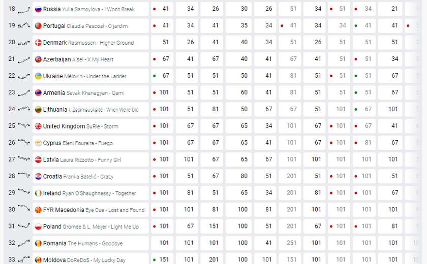 На третьем месте —чешский исполнитель Миколас Йозеф. Армения не вошла в Топ-15 претендентов на победу. Севака Ханагяна на этот раз подняли на строчку выше, он уже 23, но все равно мы уступаем даже азербайджанской исполнительнице.