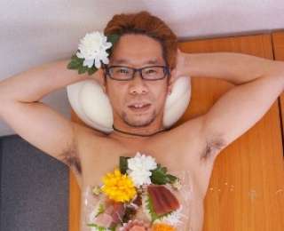 Несмотря на свой опыт мистер Сато хихикал, как школьница, в тот момент когда команда снимала свежую рыбу с его тела. Живот и маленькие мужские сиськи тихо покачивали кусочки сашими. Сами же соски были спрятаны под горками васаби