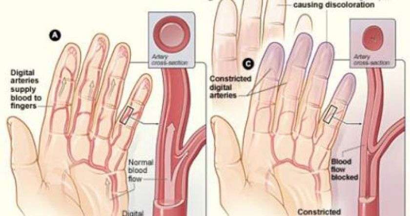 Когда артериолы, которые доставляют кровь пальцам, ногам, ушам и кончику носа, стягиваются, состояние называется феноменом Рейно. Он может безвредно проявляться сам по себе у здоровых людей, особенно у женщин, или это может быть результатом таких состояний, как атеросклероз, артрит и аутоиммунные заболевания.