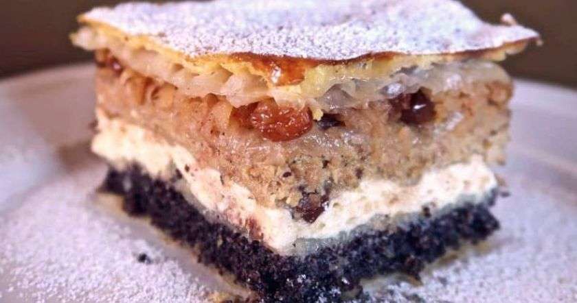 - Смажь тесто в форме растопленным маслом и выложи в него половину начинки из мака. Прикрой листом пресного теста, затем выложи половину творожной начинки, на нее — еще один лист пресного теста. Смажь его маслом и распредели половину ореховой начинки, на нее половину яблочной, которую снова прикрой пресным тестом. Смажь топленым маслом и повтори сборку пирога в такой же последовательности.