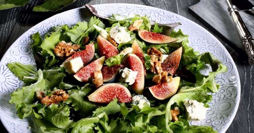 - Приготовь заправку: смешай оливковое масло, мёд, горчицу и винный уксус. Щедро полей салат с инжиром заправкой и скорее подавай к столу в порционных тарелках. Пальчики оближешь!