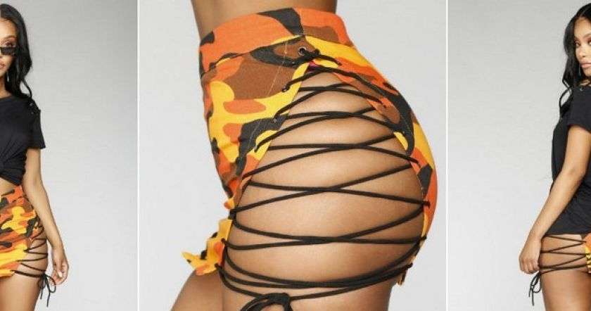 Бренд Fashion Nova известен своими сексуальными фасонами одежды. Недавно производитель представил оригинальную юбку с камуфляжным принтом и шнурками по бокам, которые практически исключают возможность ношения белья. Стоит такая юбочка $37.99. Бренд американский, поэтому придется еще доплатить за доставку и подождать некоторое время прибытия покупки.