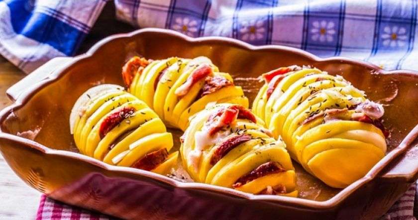 - Колбасу нарежь полукольцами и вставь в прорези картошки.