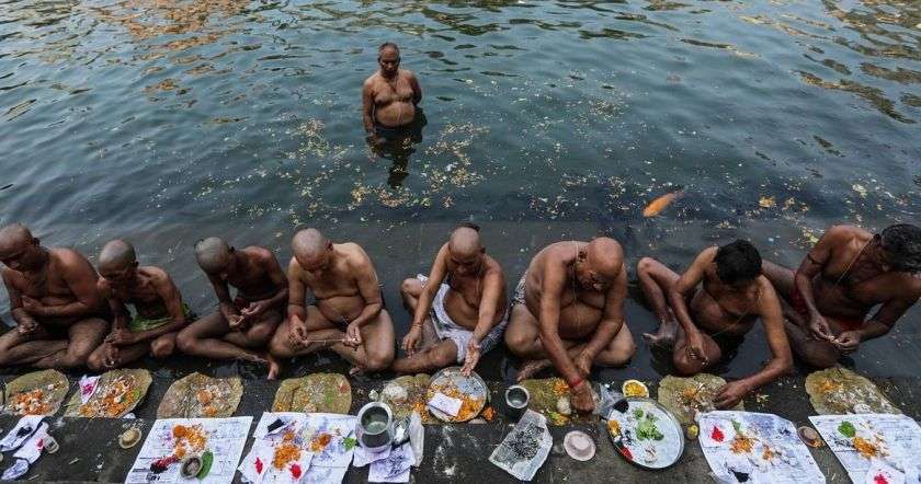 В период из 16 лунных дней Индуистские верующие проводят ритуал "Тарпан" во время молитвы Махалая, также известный как Питру Пакша, в священных водах Банганга в Мумбаи, Индия. Махалая празднуется за семь дней до индуистского фестиваля Дурга Пуджа. В этот день верующие воздают почести и обещают послушание своим умершим предкам.