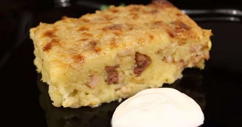 Картофельную массу для бабки не отжимают, оставляя в картошке весь сок. Только представь: золотистая корочка, а внутри сочный картофель, в котором скрывается нежная грудинка и ароматный лучок. Подается картофельная бабка с мясомобязательно горячей, со сметанным соусом.